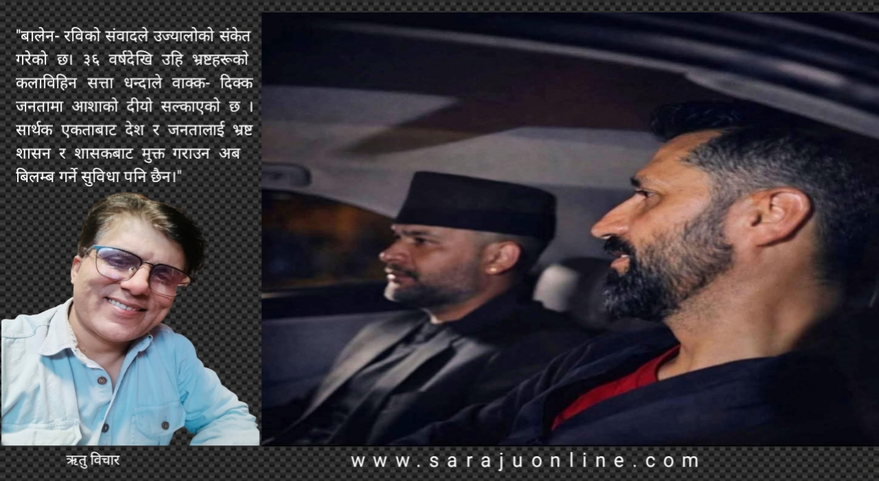 यही जटिलतामा बालेन रवि मिलन, हुदैछ यही माहोल र मागसहित । राजनीतिक पूँजी बनाउँदैछन्, बालेन रवि । लोकपृयतासंगै निर्विकल्प बनेका छन् ,उनीहरू। सत्ताको प्रतिशोधको भट्टीमा खारिएका रवि र परिवर्तनको यात्रामा कत्लेआम गरिएका पात्र हुन् बालेन। सत्ताद्वारा जबर्जस्ती किनाराकृत गराइए रवि बालेन।यद्यपि राजनीतिक र कानुनी प्रश्न छन् ,रवि र बोनमाथि । यी प्रश्न दण्डित भन्दा पनि प्रतिशोधि छन् धेरै । थाहै छ, दुनियाँ लोकलाई पनि।