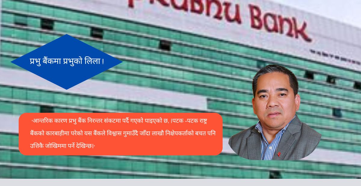राष्ट्र बैंकबाट ‘क’ वर्गको इजाजत प्राप्त वाणिज्य बैक हो, प्रभु बैंक। १५ बढी बैक तथा वित्तीय संस्थालाई मर्ज गरेको यस बैक ग्लोबल आइएमइपछिको बैकको रुपमा हेरिएको छ। तर, २०७९ पुसमा सेन्चुी बैकलाई मर्ज गरे यता यस बैकभित्र विभिन्न काण्ड बाहिरिने गरेका छन्। गएको दुई वर्षमा बैैकको बैकिङ सुशासन देखि व्यवस्थापकीय अवस्था निकै गिर्दाे छ।